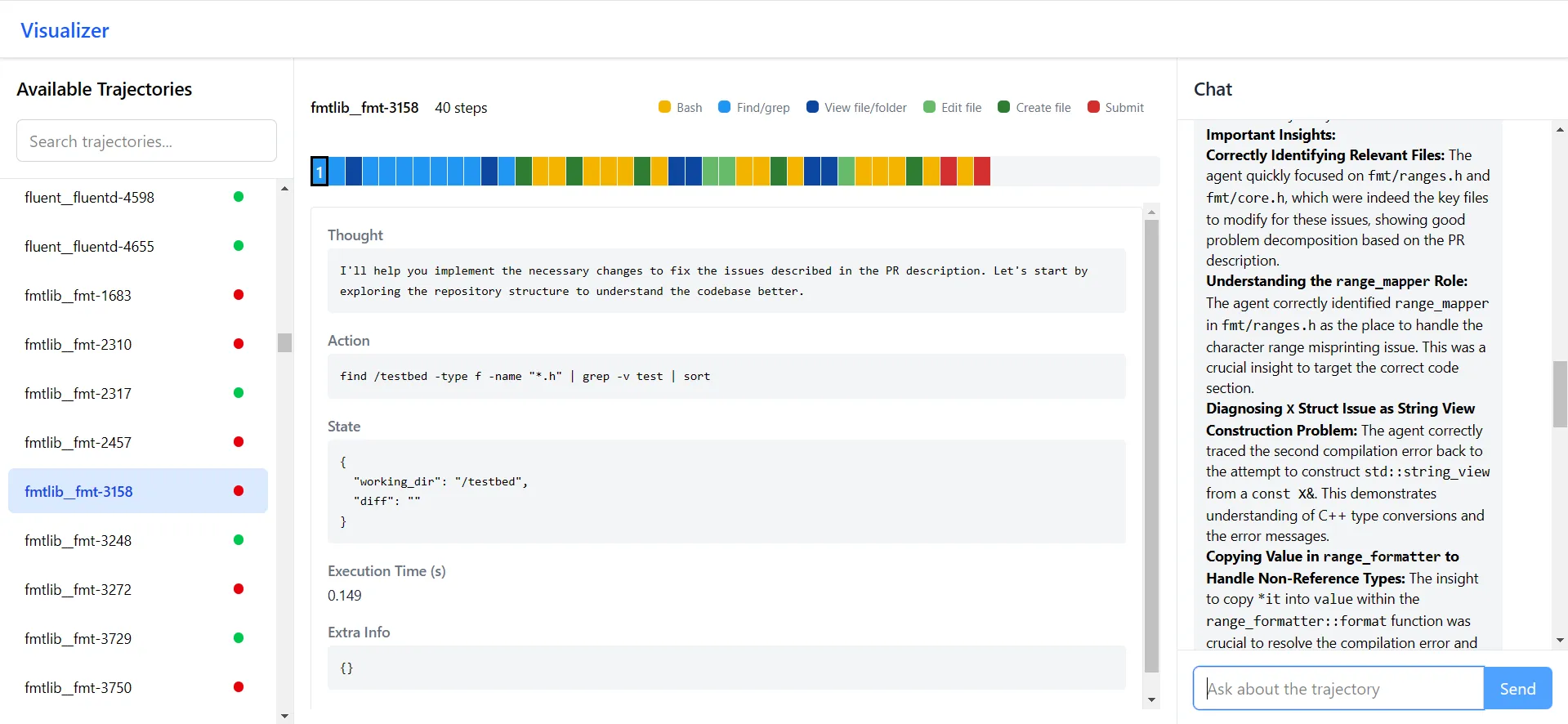 To help look for patterns in the trajectories of successful and failed tasks, I created a web app that displays the actions taken by the SWE-agent in a task. A chat pane on the side let me ask questions about the trajectory. Unfortunately, I wasn't able to find any patterns in the trajectories.