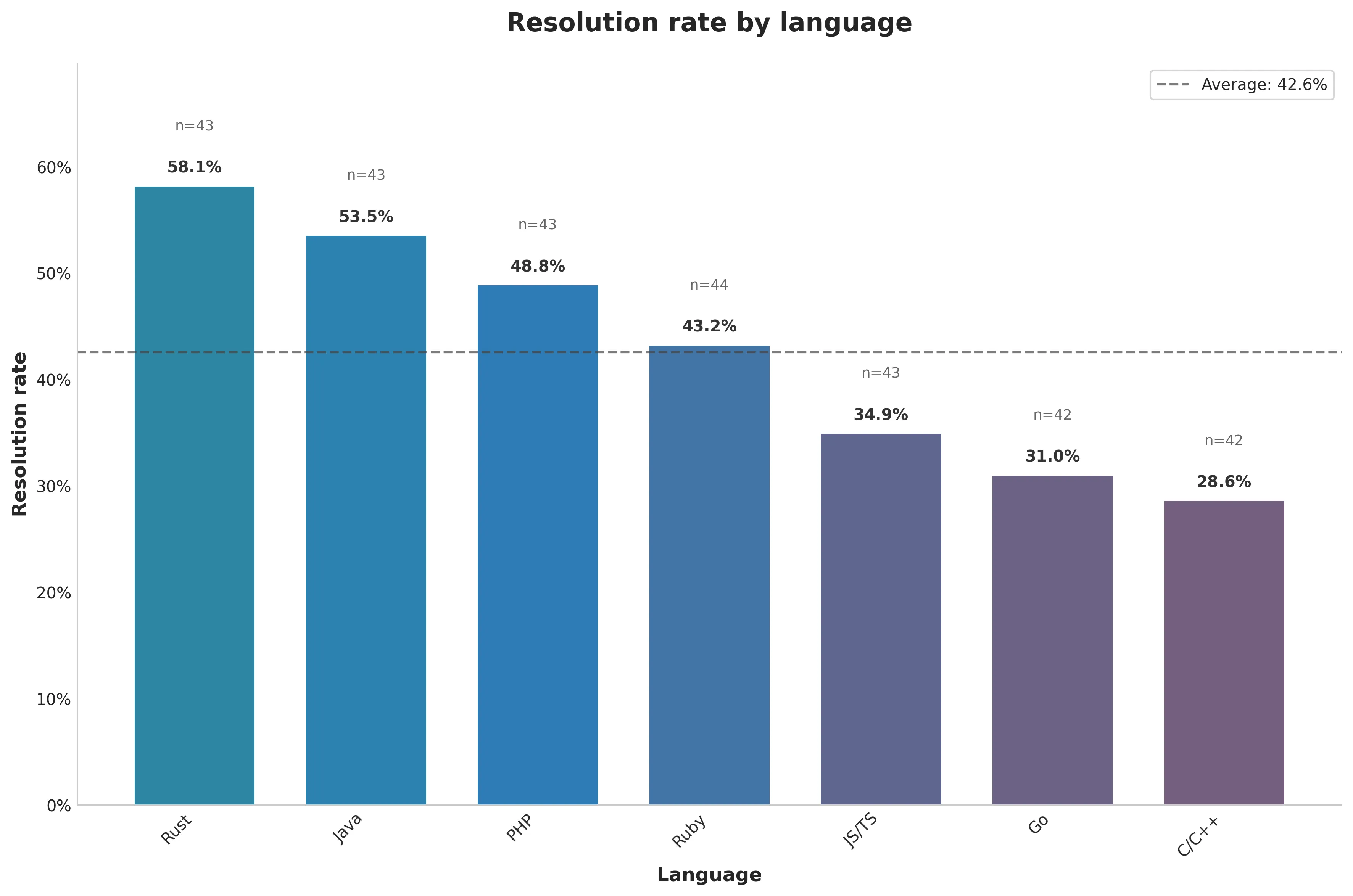 Resolution rate varies by language (figure 2), with Rust having the highest resolution rate and C/C++ the lowest.